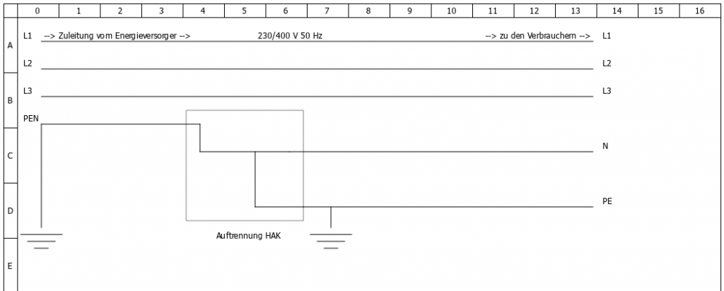 Im Schaltbild (unten) sehen wir ein TN-C-S Netz, vor der Auftrennung im HAK kommt die Zuleitung des Energieversorgers im TNC Netz. Der PEN wird im Hauptanschlusskasten (HAK) dann separiert zum Neutralleiter und PE Leiter.